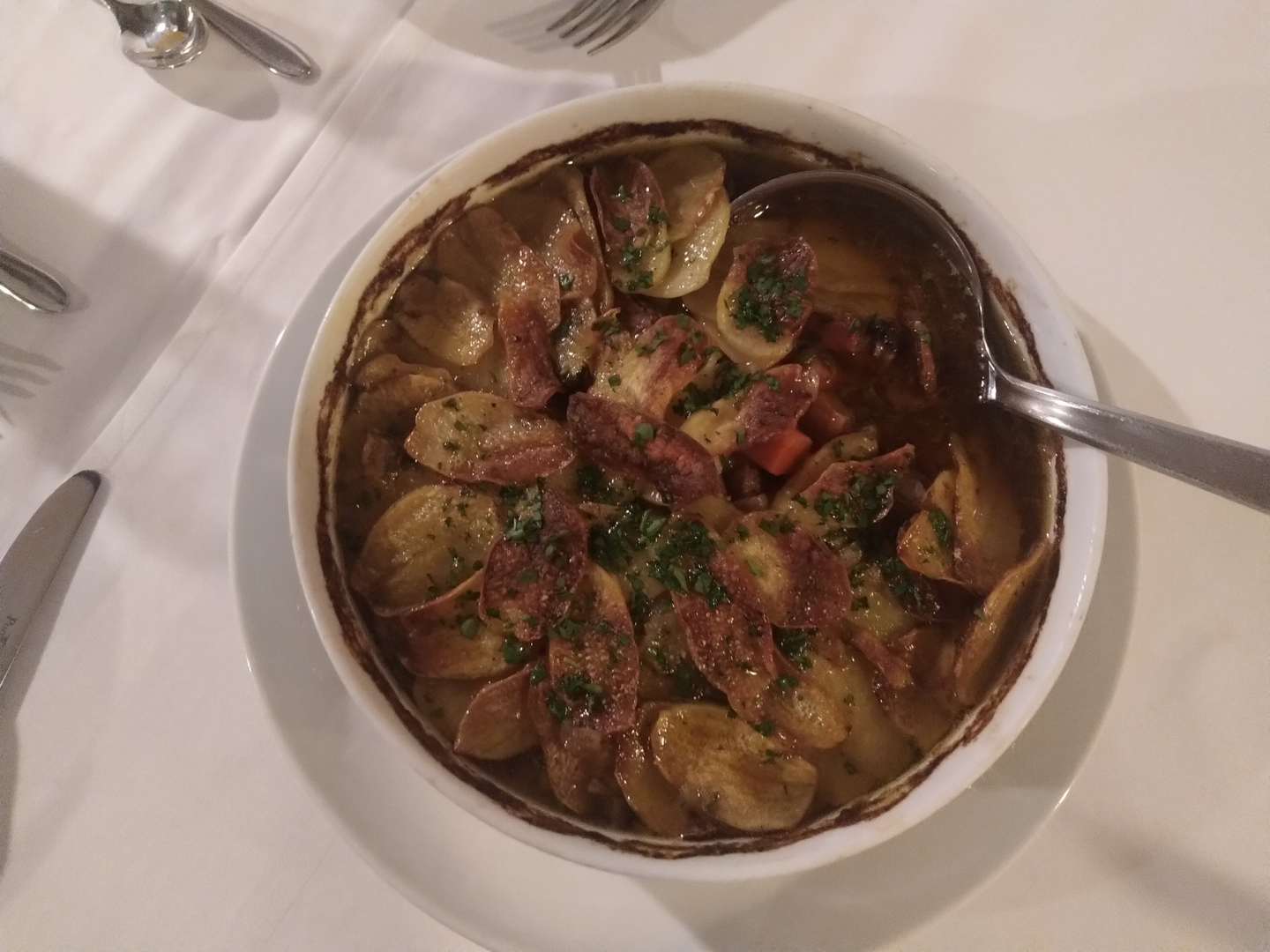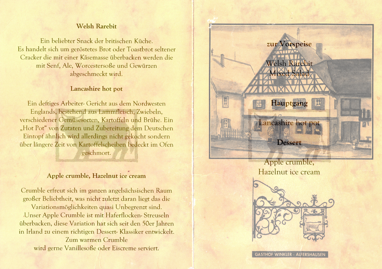 Den Auftakt des diesjährigen Menüs bildete eine Spezialität aus Wales: Welsh Rarebit – geröstetes Toastbrot mit einer würzigen Käsekruste überbacken. Anschließend wurde mit Lancashire Hotpot ein traditioneller Eintopf aus dem Nordwesten Englands serviert. Den krönenden Abschluss machte ein im angelsächsischen Raum sehr beliebtes Dessert: Apple Crumble mit Hazelnut Ice Cream.